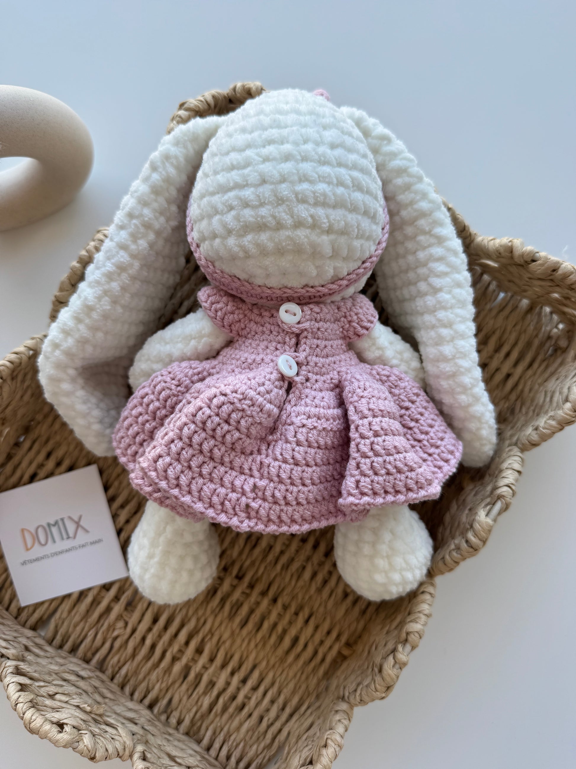 Ce charmant lapin en peluche, vêtu d'une douce robe rose et d'un bandeau assorti, est le compagnon idéal pour les tout-petits. Son design minimaliste et ses détails délicats en font un magnifique cadeau d'anniversaire ou pour toute autre occasion spéciale.