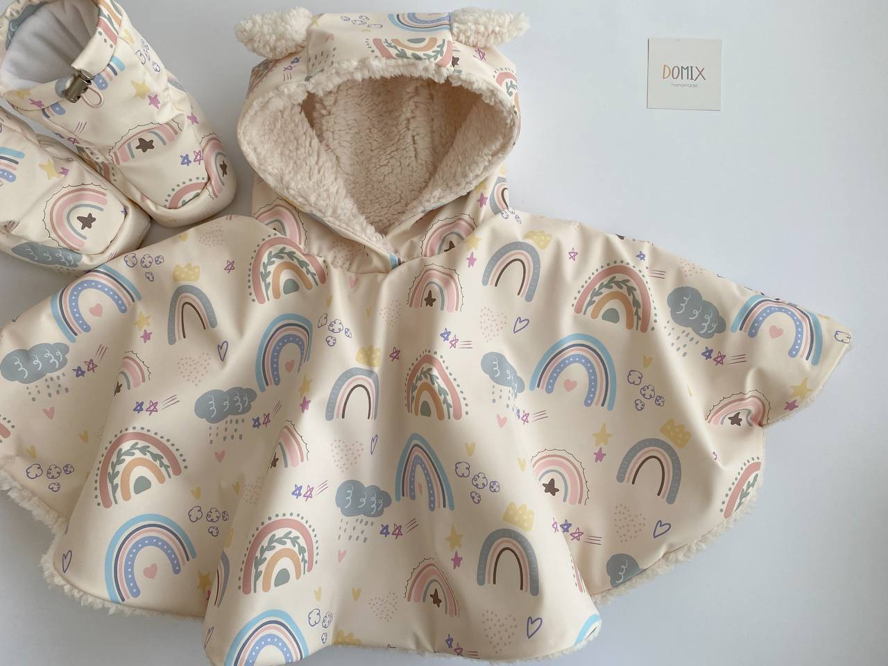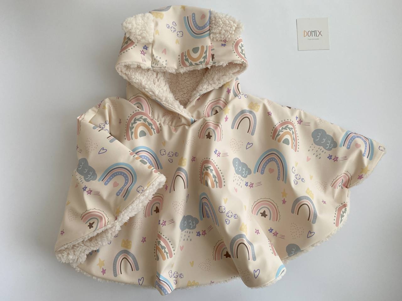 Bring color to cloudy days with our handmade waterproof poncho, decorated with soft pastel rainbows and a cozy teddy-lined hood with fluffy 3D ears.