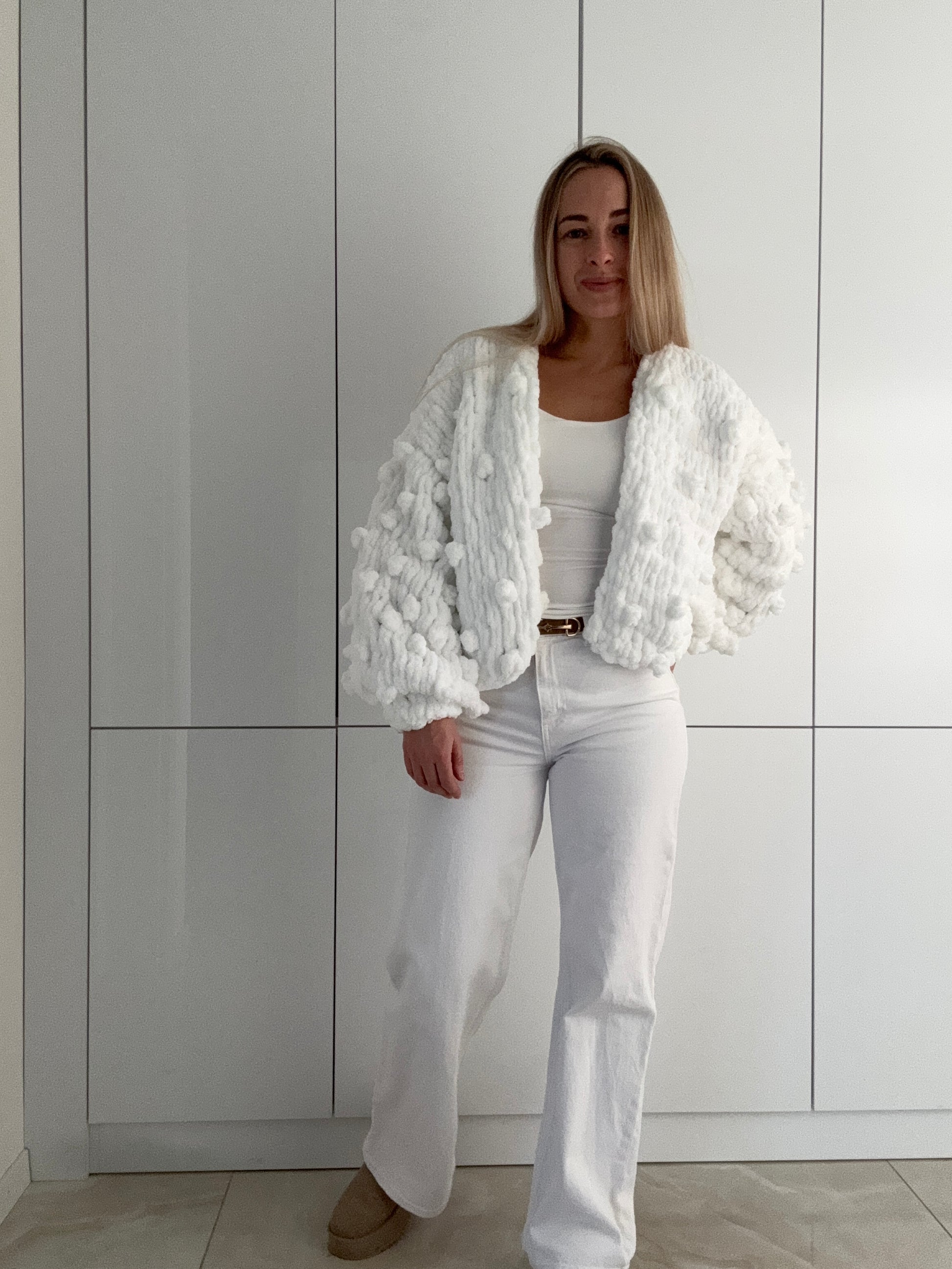 Ce cardigan blanc élégant est une pièce unique, entièrement tricotée à la main et conçue pour se distinguer par sa texture, sa douceur et son savoir-faire. Confectionné dans une laine moelleuse et volumineuse, il offre un toucher riche et des détails en relief délicats qui créent un effet vaporeux.